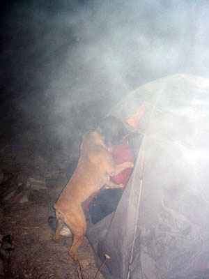 спальника, чтобы затащить собаку внутрь. Привыкший к домашнему
