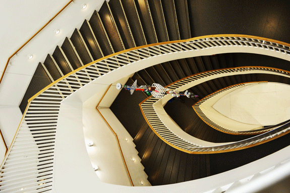 На широкой лестнице ведущей в музей любят рассаживаться его посетители. Эта расслабленность - верный знак того, что речь идет о модерном искусстве. Само здание дышит жизнью: заполненные солнечным светом коридоры, три этажа выставочных залов, с самыми разными картинами и арт-инсталляциями, кафе, живописный сад скульптур, театр на 300 мест, где постоянно проводятся лекции или представления. Один-два раза в месяц, уже после закрытия музея, здесь проходят шоу, звучит живая музыка. Итак, в левой части высоченного фойе - потрясающей белизны винтовая элептическая лестница (дизайнер Иосиф Пол Клейхуес)