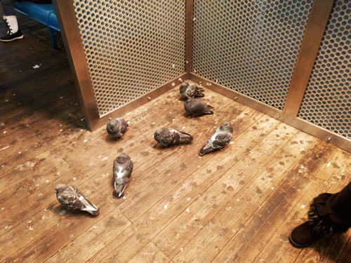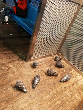 Голубь птица пугливая и обычно перед приближением человека сразу взлетает, уступая ему место. Но не тут-то было. Даже гонимые, они не собираются улетать. В лучшем случае ворчливо подвинутся, не отдавая место под этим "солнцем". Инстинкт самосохранения побеждает страх. Человек, они предполагают, всё же менее жесток, чем мороз, особенно чикагский, и из двух зол выбирают наименьшее.