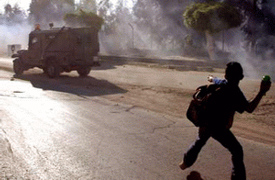 Палестинский школьник бросает бутылку с зажигательной смесью в сионистский патрульный джип. Наблус 14 октября 2003 года |